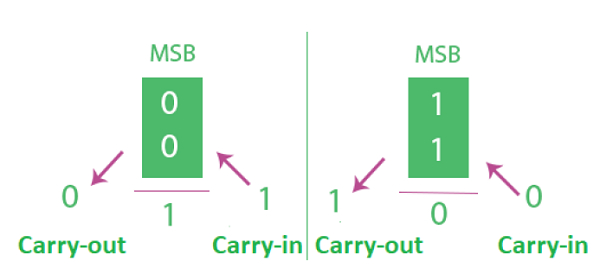 在第一个图的情况下,两个数字的 MSB 为 0,表示它们为正数。这里,如果进位输入为 1,我们得到结果的 MSB 为 1,表示结果为负数(溢出),进位输出为 0。进位输入不等于进位输出,因此发生溢出。