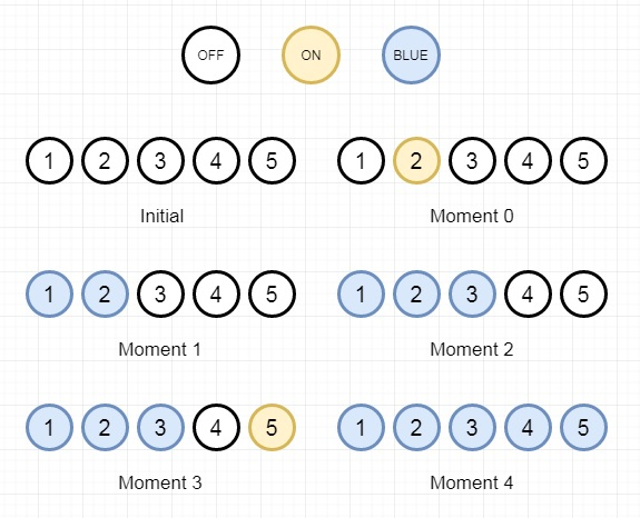 假设我们有一个房间里有 n 个灯泡,从左到右从 1 到 n 编号排列。最初,所有灯泡都是关着的。在时刻 k(对于 0 到 n - 1 范围内的 k),我们打开 light[k] 灯泡。只有当一个灯泡处于开启状态,并且其左边的所有灯泡也都处于开启状态时,这个灯泡才变为蓝色。我们必须找出所有开启灯泡都为蓝色的时刻的数量。这是一个示例 −