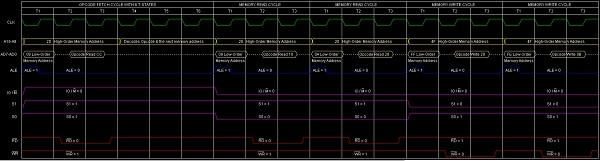 **总结** − 因此,此指令 **CZ** 需要 3 个字节、5 个机器周期(操作码获取、内存读取、内存读取、内存写入、内存写入)和 18 个 T 状态才能执行,如时序图所示。