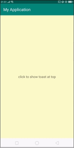 <?xml version="1.0" encoding="utf-8"?> <LinearLayout xmlns:android="http://schemas.android.com/apk/res/android" android:id="@+id/parent" xmlns:tools="http://schemas.android.com/tools" android:layout_width="match_parent" android:layout_height="match_parent" tools:context=".MainActivity" android:gravity="center" android:background="#33FFFF00" android:orientation="vertical"> <TextView android:id="@+id/text" android:textSize="18sp" android:textAlignment="center" android:text="click to show toast at top" android:layout_width="match_parent" android:layout_height="wrap_content" /> </LinearLayout>