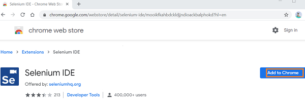 最初,Selenium IDE 用作 Firefox 插件。但最新版本的 Selenium IDE 同时支持 Chrome 和 Firefox。若要在 Chrome 中安装,导航至以下链接 -