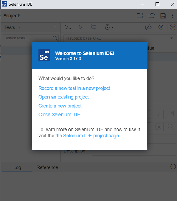 点击该图标,即可启动 Selenium IDE,并显示如下欢迎界面。