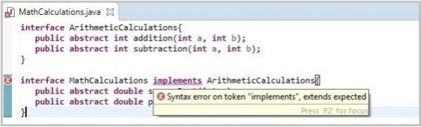1 error如果使用 eclipse 编译相同的程序,它会给你一个编译时错误,提示“应使用 extends 关键字,而不是 implements 关键字”。