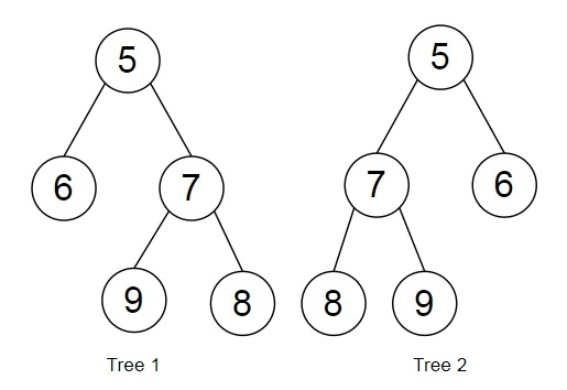 def make_tree(elements): tree = tree_node(elements[0]) for element in elements[1:]: insert_value(tree, element) return tree def insert_value(temp,value): que = [] que.append(temp) while (len(que)): temp = que[0] que.pop(0) if (not temp.left): if value is not None: temp.left = tree_node(value) else: temp.left = tree_node(0) break else: que.append(temp.left) if (not temp.right): if value is not None: temp.right = tree_node(value) else: temp.right = tree_node(0) break else: que.append(temp.right) class tree_node: def __init__(self, value): self.value = value self.left = None self.right = None def solve(tree_1, tree_2) : if (tree_1 == None and tree_2 == None) : return True if (tree_1 == None or tree_2 == None) : return False queue1 = [] queue2 = [] queue1.append(tree_1) queue2.append(tree_2) while (1) : size1 = len(queue1) size2 = len(queue2) if (size1 != size2): return False if (size1 == 0): break curr_level1 = [] curr_level2 = [] while (size1 > 0): node1 = queue1[0] queue1.pop(0) if (node1.left != None) : queue1.append(node1.left) if (node1.right != None) : queue1.append(node1.right) size1 -= 1 node2 = queue2[0] queue2.pop(0) if (node2.left != None) : queue2.append(node2.left) if (node2.right != None) : queue2.append(node2.right) curr_level1.append(node1.value) curr_level2.append(node2.value) curr_level1.sort() curr_level2.sort() if (curr_level1 != curr_level2) : return False return True tree_1 = make_tree([5, 6, 7, 9, 8]) tree_2 = make_tree([5, 7, 6, 8, 9]) print(solve(tree_1, tree_2))