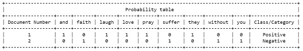Probabilities of each word in the 'Positive' category are: P(suffer/+) = 0.1111 P(without/+) = 0.1111 P(love/+) = 0.2222 P(laugh/+) = 0.2222 P(and/+) = 0.2222 P(pray/+) = 0.2222 Probability of text in 'Positive' class is : 0.00000000 Probabilities of each word in the 'Negative' category are: P(suffer/-) = 0.1111 P(without/-) = 0.1111 P(love/-) = 0.0556 P(laugh/-) = 0.0556 P(and/-) = 0.0556 P(pray/-) = 0.0556 Probability of text in 'Negative' class is : 0.00000012 By Naive Bayes Classification, we can conclude that the given belongs to 'Negative' class with the probability 0.00000012