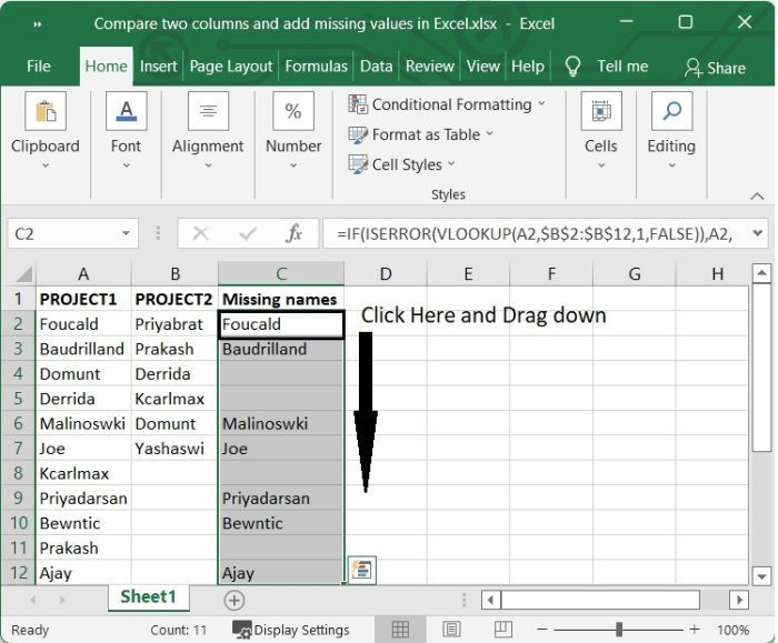 在本教程中,我们解释了如何使用IF、ISERROR和VLOOKUP函数来比较并添加两个列表中缺失的名称。