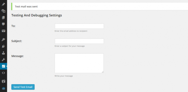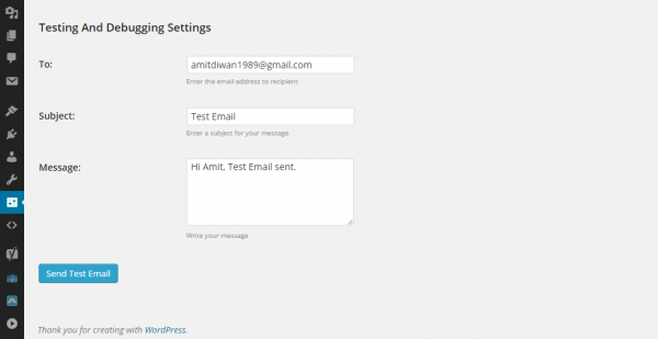 在下方,我们可以找到测试和调试设置。此部分由插件提供,用于测试电子邮件的发送和接收。以下屏幕截图显示了相同的内容,只需输入值并单击发送测试电子邮件:−