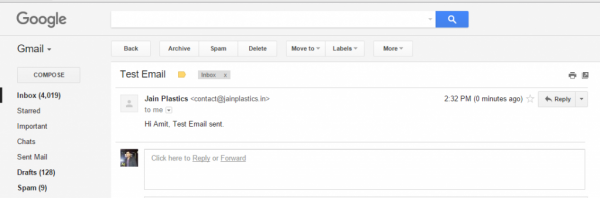 现在,我们可以检查电子邮件帐户,并看到我们已收到一封来自:contact@jainplastics 且名称为Jain Plastics 的电子邮件,我们在步骤 5中设置过。以下是显示在我的 Gmail 帐户中从官方域名特定电子邮件 ID 收到的电子邮件的屏幕截图。