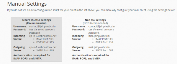 现在我们将看到“contact@jainplastics.in 的邮件客户端配置”窗口将打开。在手动设置下,选择安全 SSL/TLS 设置。以下是显示详细信息的屏幕截图:−