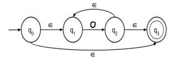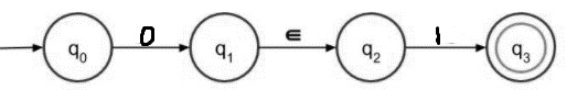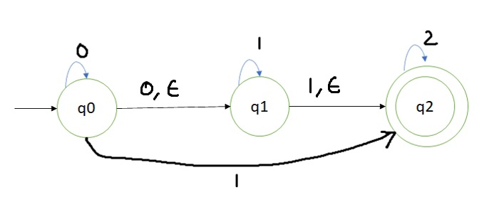 如果我们得到起始符号 1,则通过 epsilon 转移,我们可以将状态从 q0 更改为 q1,然后输入 1 可以处于状态 q1。