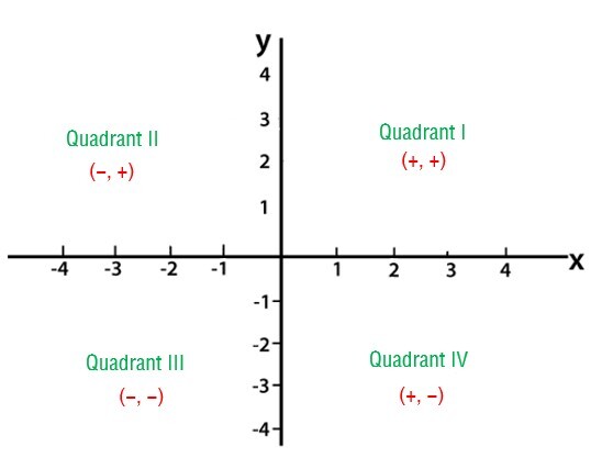在坐标平面中,我们有四个象限,因为x轴和y轴将平面分成四个部分,这些部分称为象限。下图显示了标记为I、II、III和IV的四个象限及其坐标符号。