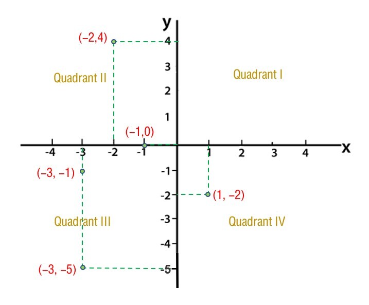 例1——坐标(-2, 4)、(-3, -1)、(-1, 0)、(1,-2)和(-3, -5)分别属于哪个象限或坐标轴?为了检查你的答案是否正确,请在笛卡尔平面上找到它们。