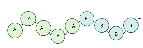 嵌段共聚物是第一种类型。当两个较长的链连接在一起时,就会形成聚合物。一条链由一种类型的单体亚基组成,而另一条链由另一组组成。这种共聚物可以被认为是两种独特的均聚物的结合。前缀“homo-”简单地表示“相同或相似”。因此,均聚物由相同或相似的单体亚基组成。想象一下,你的左手拿着一块嵌段共聚物,右手拿着一块,每块都包含一条单独的均聚物链。当你将这两者结合在一起时,就会产生嵌段共聚物。这是一张显示嵌段共聚物形式的图,它由单体“B”和“A”组成。