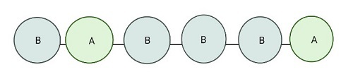 无规共聚物是第二种类型。当单体亚基以随机的方式连接在一起时,就会形成无规共聚物。想象一下,你拿几个单体,把它们抛向空中,然后观察它们落到地上。无论这些单体落在哪里,当连接在一起时,它们都会形成一条独特的随机链。下面是一张图,显示了由单体 A 和 B 组成的无规共聚物的组成。