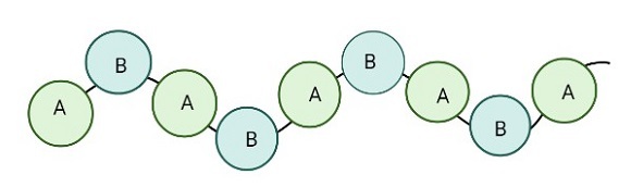 第三种类型,也称为交替共聚物,是最后一种但并非最不重要的一种。交替连接在一起形成聚合物链的单体构成了交替共聚物。让我们检查一下这种共聚物的结构,以便清楚地了解它是什么。