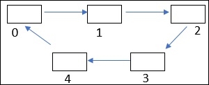 Enter the source: 0 Enter the destination: 1 Enter the source: 1 Enter the destination: 2 Enter the source: 2 Enter the destination: 3 Enter the source: 3 Enter the destination: 4 Enter the source: 4 Enter the destination: 0 There is a cycle in this graph...
