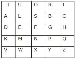 发送方和接收方决定一个特定的密钥,例如“tutorials”。在密钥表中,表中的第一个字符(从左到右)是该短语,不包括重复的字母。表的其余部分将填充剩余的字母表字母,按自然顺序排列。密钥表如下所示:-