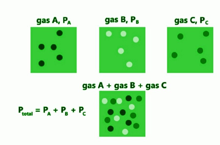 根据气体动理论,气体扩散以充满容器中占据的空间,因为它没有分子间相互作用。换句话说,气体混合物中的粒子间隔足够大,可以独立于彼此而不会相互作用。由于没有与其他物质粒子的相互作用,因此理想气体的压力是由其与容器的相互作用决定的,而不是由其与其他物质粒子的相互作用决定的。在不改变另一种气体压力的前提下,气体会膨胀以充满其所封闭的容器。因此,可以说气体的压力取决于其分子量、体积和温度。混合物中不同气体的温度 (T) 和体积 (V) 是相同的,因为它们都包含在同一个容器中。容器中所含气体的总压力可以通过将每种气体在系统中产生的压力加起来计算。