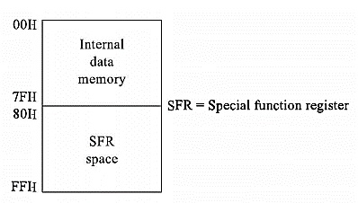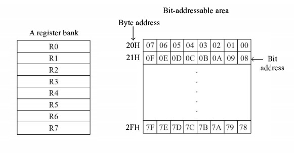 当所有寄存器组都被使用时,暂存器区域将为20H到7FH。但是,从20H到2FH(16字节或128位)可以用作位寻址RAM。通过使用一些带有8位内存地址的简单指令,我们可以检查位寻址。例如,指令**CLR 6FH**清除了6FH位置。众所周知,8位地址可以定位256个不同的位置,但这里只有128位是可寻址的。另一个位寻址位置段是80H到FFH。RAM的其余位置(30H到7EH)可用于存储变量数据和堆栈。