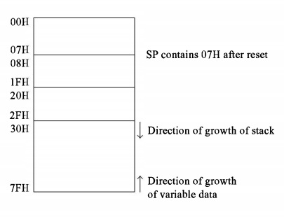 8051中的堆栈区域始终可以在内部数据存储器中实现。这里的堆栈指针(SP)只是一个8位寄存器,因为内部RAM区域仅在00H到7FH范围内,当所有寄存器组都被使用时,堆栈位置将在30H到7FH范围内。在这种情况下,SP将初始化为2FH。