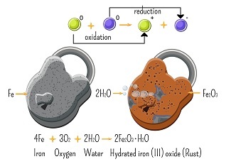 氧化和还原过程同时发生的反应称为氧化还原反应。在这里,我们可以将氧化定义为添加氧气 (𝑂2) 或去除(消除)氢气 (𝐻),还原可以定义为添加氢气 (𝐻) 或去除(消除)氧气 (𝑂2) 原子。氧化铜和氢原子之间的反应是氧化还原反应的一个例子。铁的生锈是氧化还原反应一个非常常见且众所周知的例子。
