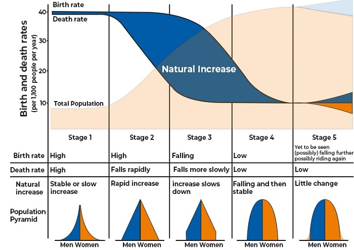 人口转变模型解释了随着世界从前工业化经济体系发展到工业化经济体系,人口变化的自然顺序。该模型侧重于生育率、死亡率和自然增长率的原因和后果。