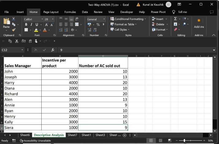步骤1 - 在MS Excel中打开一个新工作表,在第一列中输入销售经理的姓名,在第二列中写入空调销售后的每件产品奖励,在第三列中写入售出的空调数量,如下图所示