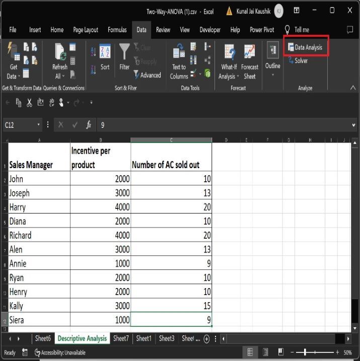 步骤2 - 点击数据选项卡,然后选择数据分析选项,如下图所示