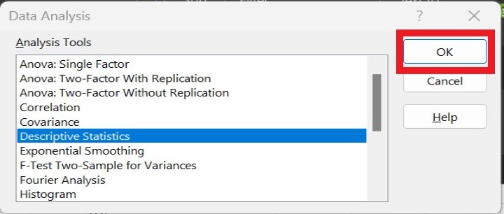 步骤3 - 将出现另一个名为数据分析的对话框。从下拉菜单中选择描述性统计选项,然后单击确定按钮。