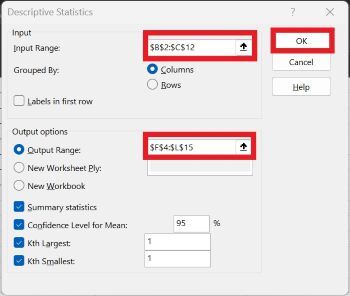步骤4 - 将打开另一个描述性统计对话框,用户必须在各自的文本框中输入输入区域和输出区域。确保用户选择非数值数据范围以获得准确的结果,否则会出错。单击“摘要统计”复选框、“均值的置信水平”复选框、“第K大”复选框和“第K小”复选框。之后,单击确定按钮。