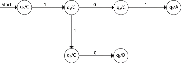 为了设计这样的机器,我们将检查两个条件:"101" 和 "110"。如果检测到 "101",则输出 A;如果检测到 "110",则输出 B;对于其他字符串,输出 C。