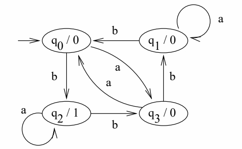 构建一个 Moore 机,对于输入字符串 "bababbb",输出为 "01100100"。