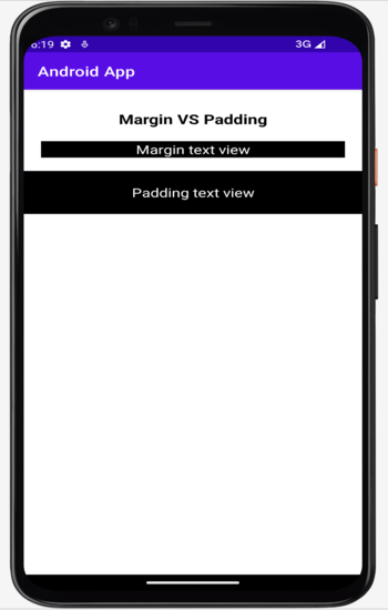 在此相对布局内,我们创建了一个 TextView,用于显示应用程序的标题。之后,我们创建了另一个 TextView,为此 TextView 添加了 margin,之后我们创建了另一个 TextView,并从所有方向为其添加了 padding。对于这两个 TextView,我们都指定了背景颜色,然后从所有方向为每个 TextView 添加了 padding 和 margin。