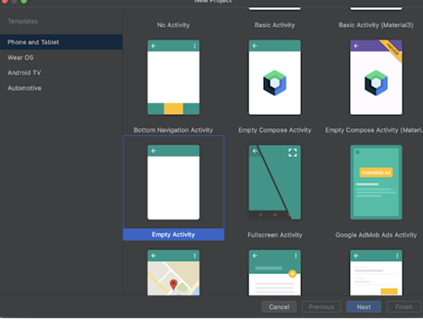 在此屏幕中,我们只需选择“空活动”并单击“下一步”。单击“下一步”后,您将看到下面的屏幕。