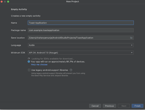 指定所有详细信息后,单击“完成”以创建新的 Android Studio 项目。