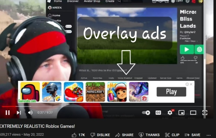 叠加广告就像横幅广告,显示在视频的底部,不会干扰观看者的观看体验。这些广告可以包含图像或文本。观看者可以根据自己的意愿与它们互动。这些视频内叠加广告非常擅长吸引观看者的注意力,而不会破坏用户体验。如今,叠加广告设计精美、动画效果出色,甚至具有互动性。这些广告占据视频窗口底部的约20%。用户在观看视频的同时可以看到您的广告,他们甚至可以随时点击右上角的“X”关闭广告。如果他们点击您的广告,则会跳转到您的目标网址。只有当观看者点击叠加广告展开并查看完整的广告活动时,广告主才需要付费。