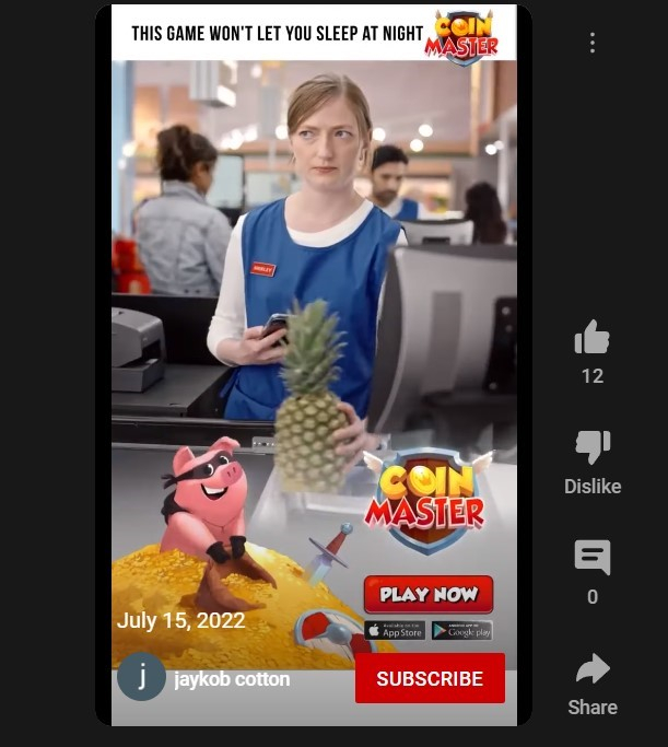 可以作为视频广告 − 无需向YouTube付费,短视频就可以充当广告。就像著名的游戏Coin Master在短视频中推广其应用一样。