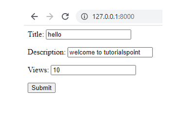 from django import forms #creating a django form class TurtorialspointForm(forms.Form): title = forms.CharField() description = forms.CharField() views = forms.IntegerField()