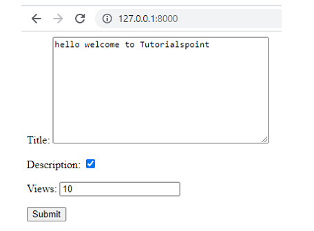from django import forms class TurtorialspointForm(forms.Form): title = forms.CharField(widget = forms.Textarea) description = forms.CharField(widget = forms.CheckboxInput) views = forms.IntegerField(widget = forms.TextInput)