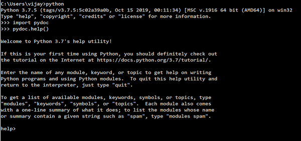 现在,导入 pydoc,然后使用 pydoc.help() 命令启动交互式 Shell。