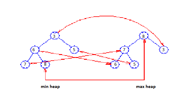 尽管图中显示每个元素都存储在最小堆和最大堆中,但实际上只需要将每个元素存储在两个堆中的一个即可。