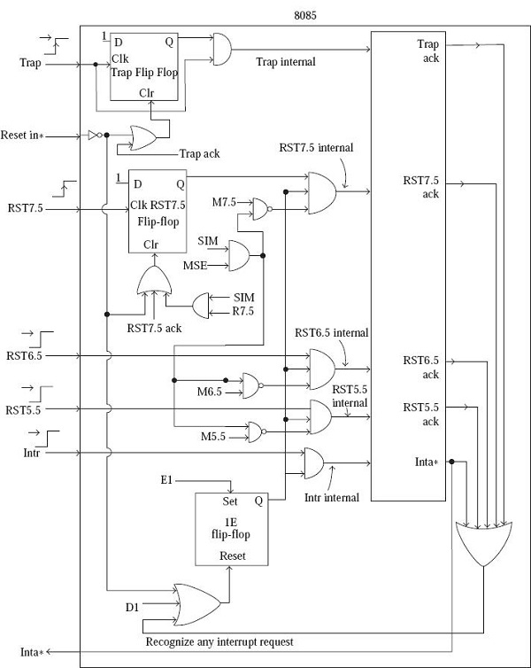 在 8085 中,有一个称为 IE 触发器的触发器。这里 IE 代表中断使能。只要此触发器复位到 0 状态,8085 中断系统就会被禁用。也就是说,即使外部中断引脚被激活,相应的内部中断信号也不会被激活。这可以在下图中观察到,该图提供了 8085 中断结构的内部架构。