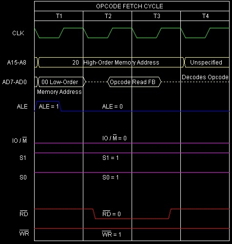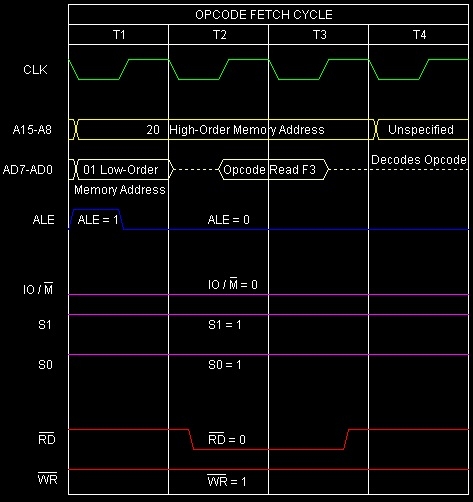 **总结** - 因此,此指令 DI 需要 1 字节、1 个机器周期(操作码获取)和 4 个 T 状态才能执行,如时序图所示。