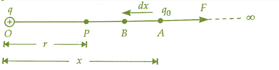 这里,一个正电荷q位于点O。现在,我们将计算距离O点r距离处的点P处的电势。根据定义,电势等于我们将一个单位正电荷从无限远处移动到我们所考虑的点P所做的功。