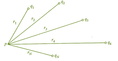 在这里,我们将测量由于N个电荷组成的系统在任意一点处的电势。假设系统中存在N个点电荷,即$\mathrm{q_{1},q_{2},q_{3},q_{4},q_{5},q_{6},q_{7}.....q_{N}}$。所有点电荷距离我们所考虑的点P的距离分别为$\mathrm{r_{1},r_{2},r_{3},r_{4},r_{5},r_{6},r_{7}.....r_{N}}$。