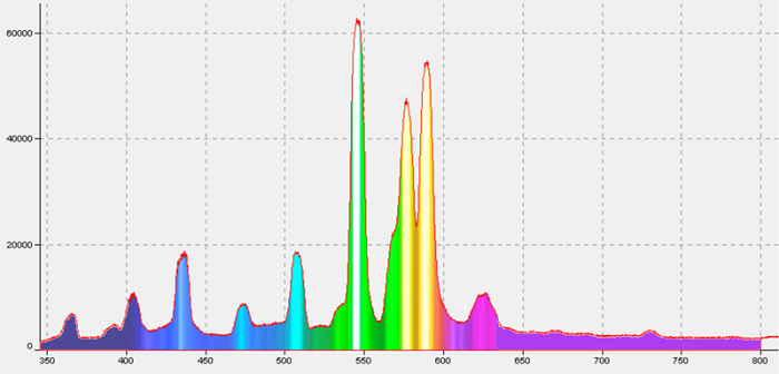 卤素灯发出连续光谱,并在某些波长处有峰值。强度在纵轴上表示,波长在横轴上表示。