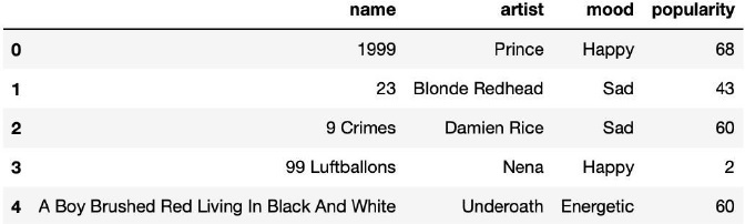 Music_Player = Music_Player[['name','artist','mood','popularity']]