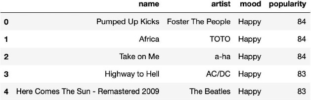 Play = Music_Player[Music_Player['mood'] == 'Happy' ] Play = Play.sort_values(by="popularity", ascending=False) Play = Play[:5].reset_index(drop=True) display(Play)