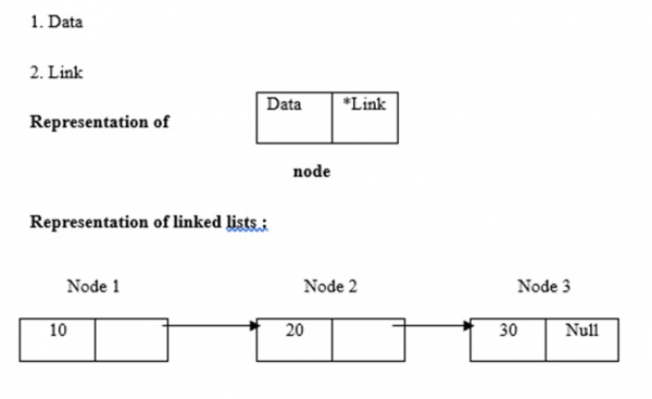 链表使用动态内存分配,即它们会根据需要增长和缩小。它们被定义为节点的集合。在这里,节点有两个部分,分别是数据和链接。数据、链接和链表的表示如下:
