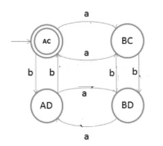 假设a的DFA图有m个状态,b的DFA图有n个状态,则叉乘m x n将有mxn个状态。